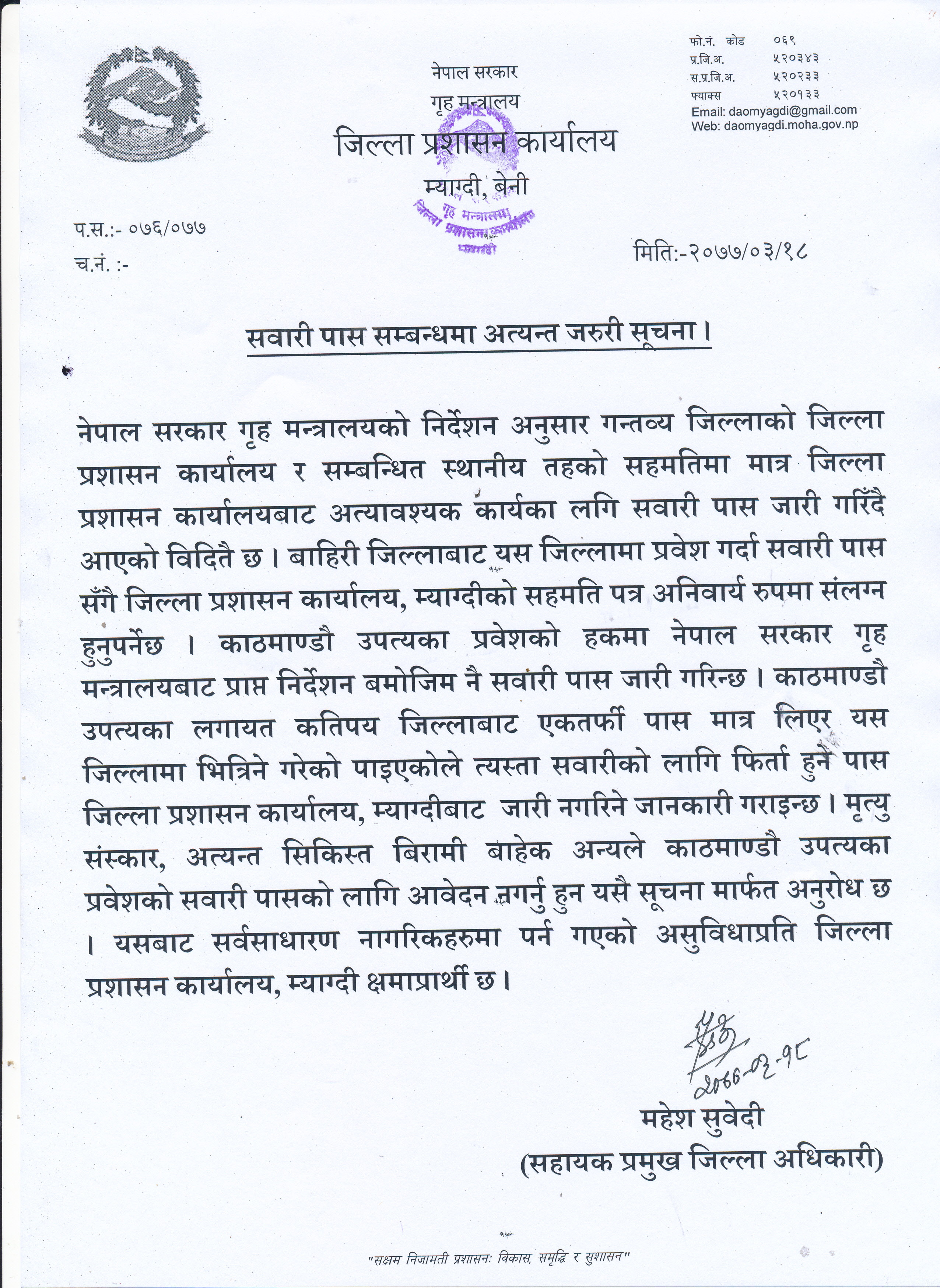 जिल्ला प्रशासन कार्यालय, म्याग्दीका प्रमुख जिल्ला अधिकारीबाट जारी आदेश