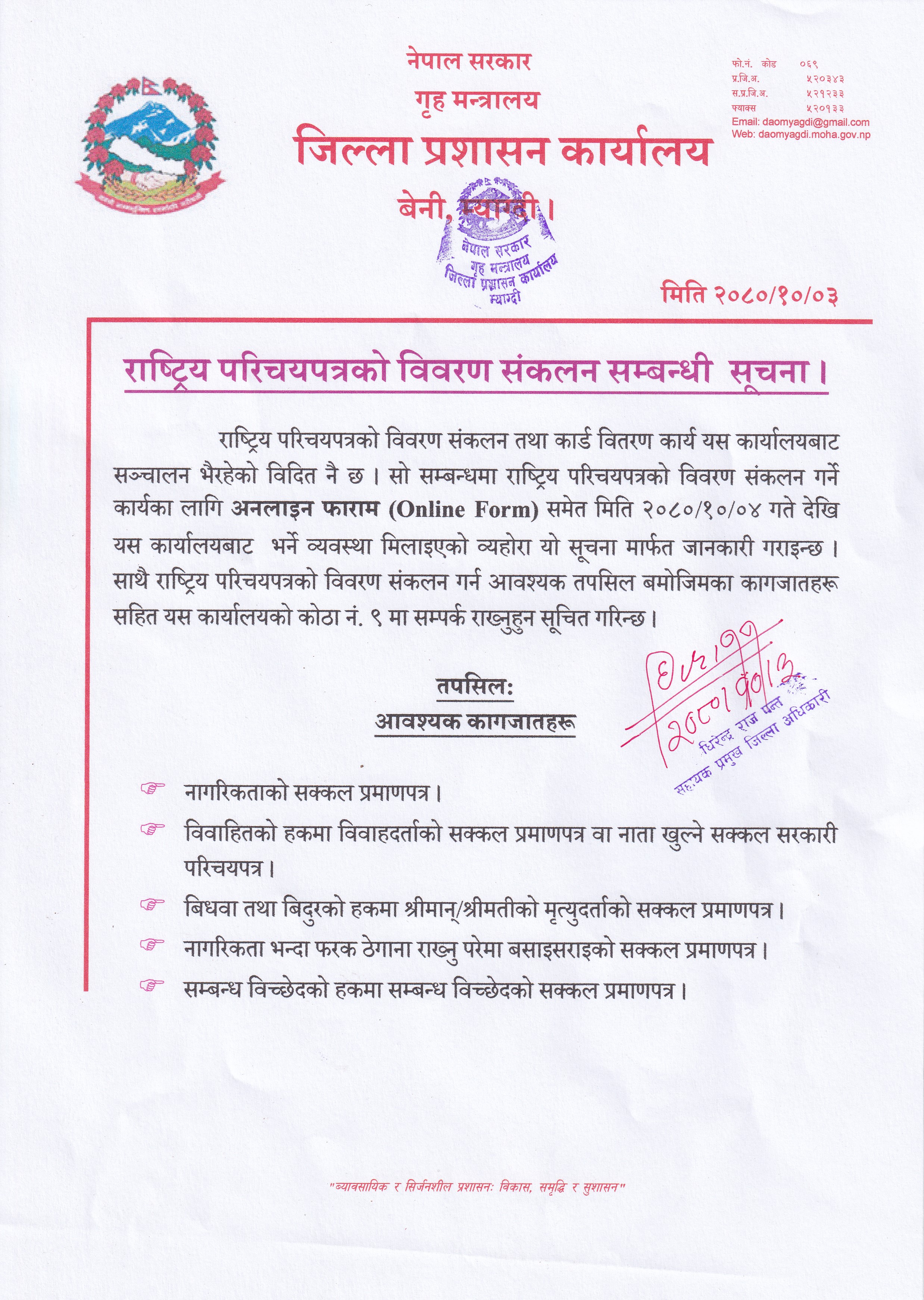 राष्ट्रिय परिचयपत्रको विवरण संकलन (अनलाइन फाराम भर्ने कार्य) जिल्ला प्रशासन कार्यालय, म्याग्दीबाट हुने सम्बन्धी सूचना ।