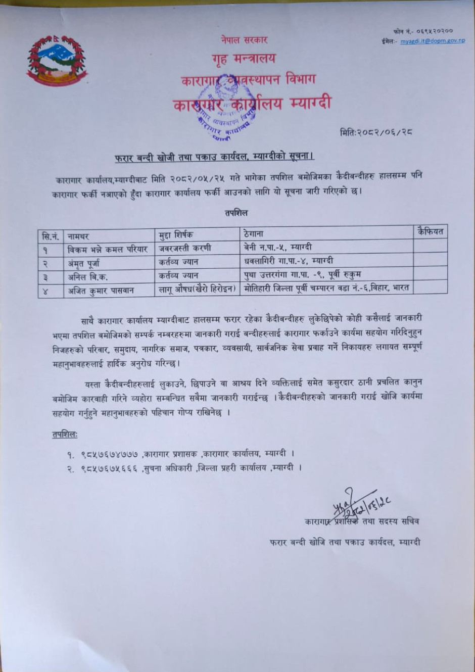 फरार बन्दी खोजी तथा पक्राउ कार्यदल म्याग्दीको सूचना ।