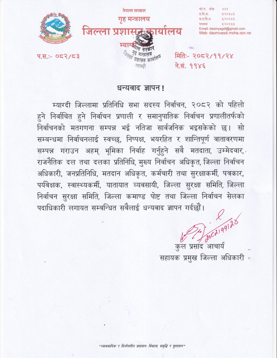 जिल्ला प्रशासन कार्यालय, म्याग्दीद्बारा धन्यवाद ज्ञापन।