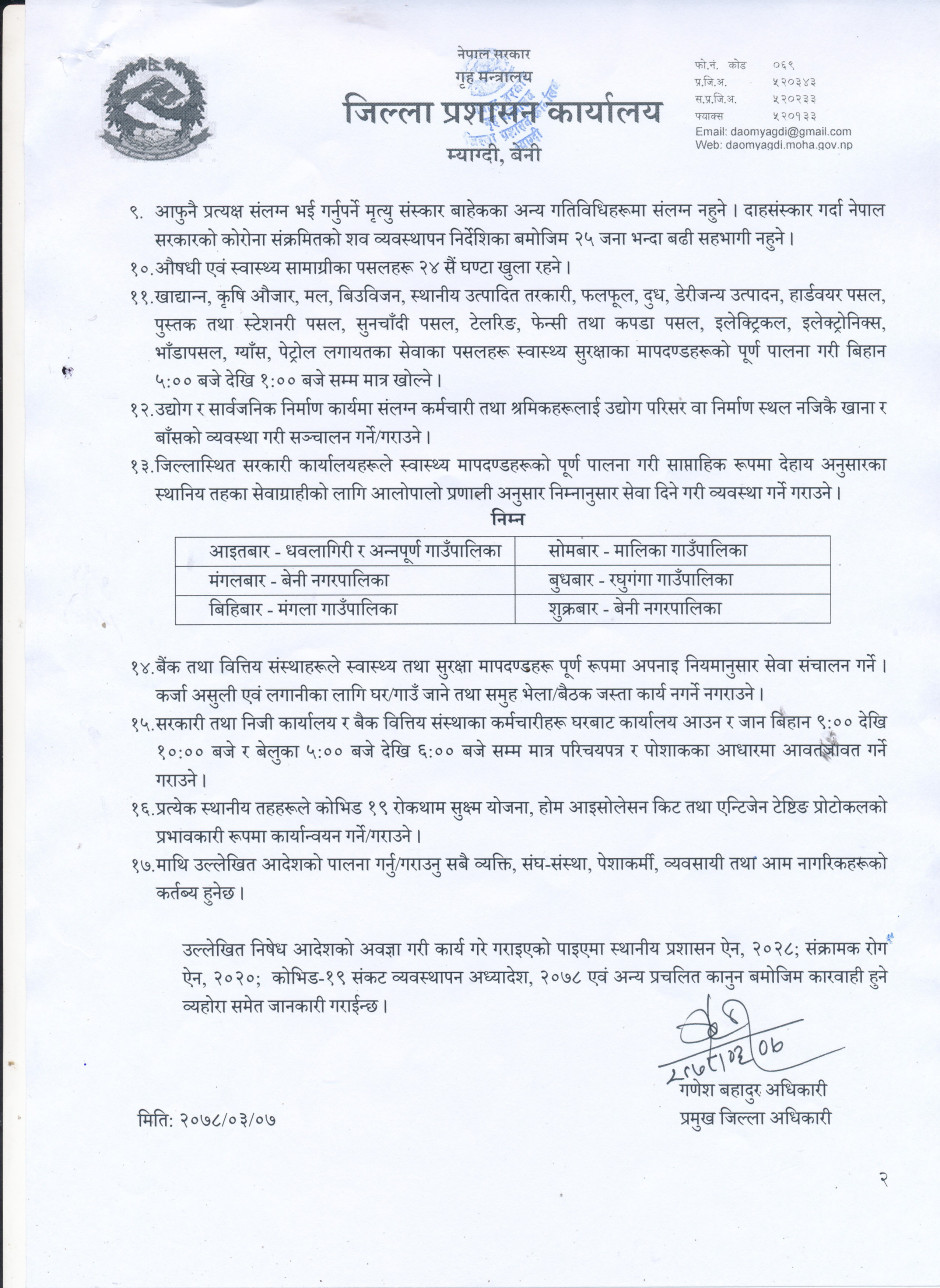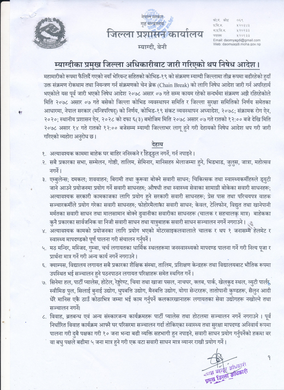 म्याग्दी जिल्लाका प्रमुख जिल्ला अधिकारीबाट जारी गरिएको निषेध आदेश !