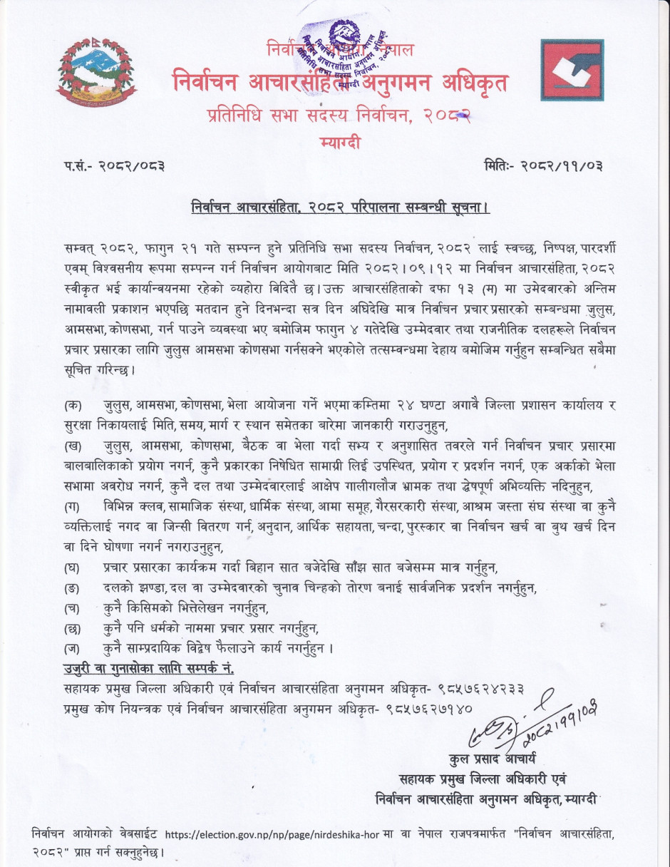 निर्वाचन आचारसंहिता, २०८२ परिपालना सम्बन्धी सूचना।