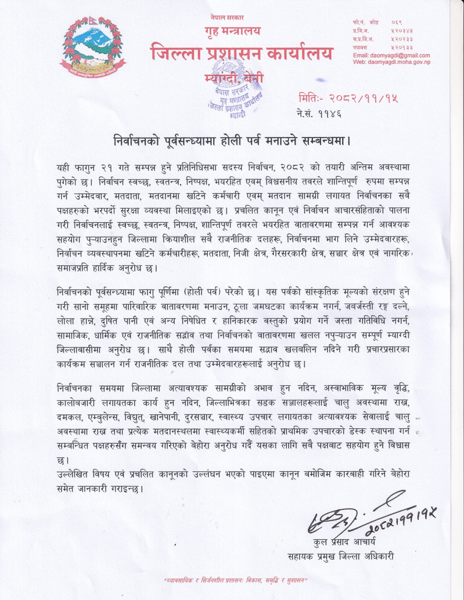 निर्वाचनको पूर्वसन्ध्यामा होली पर्व मनाउने सम्बन्धमा।