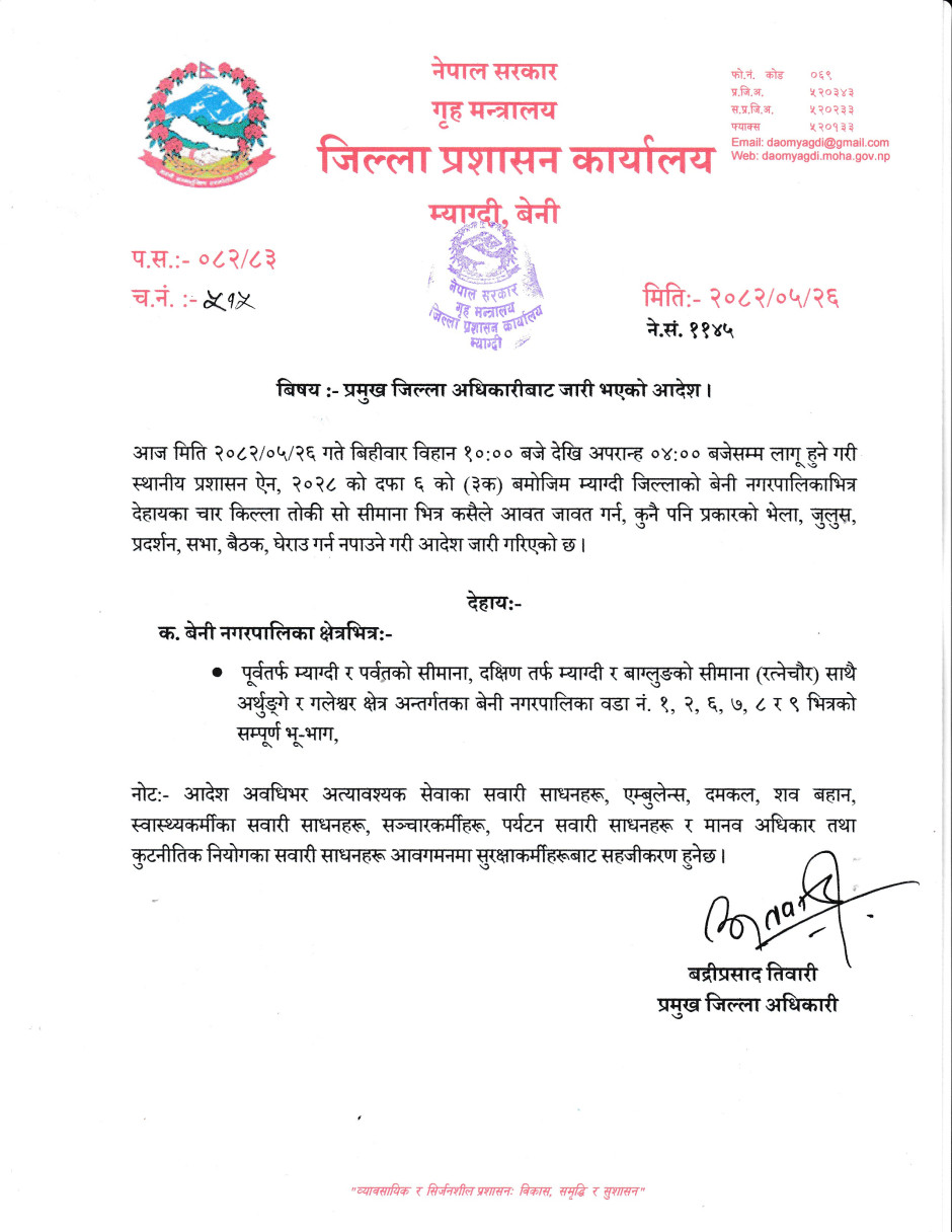 प्रमुख जिल्ला अधिकारीबाट मिति २०८२/०५/२६ गते जारी भएको आदेश ।