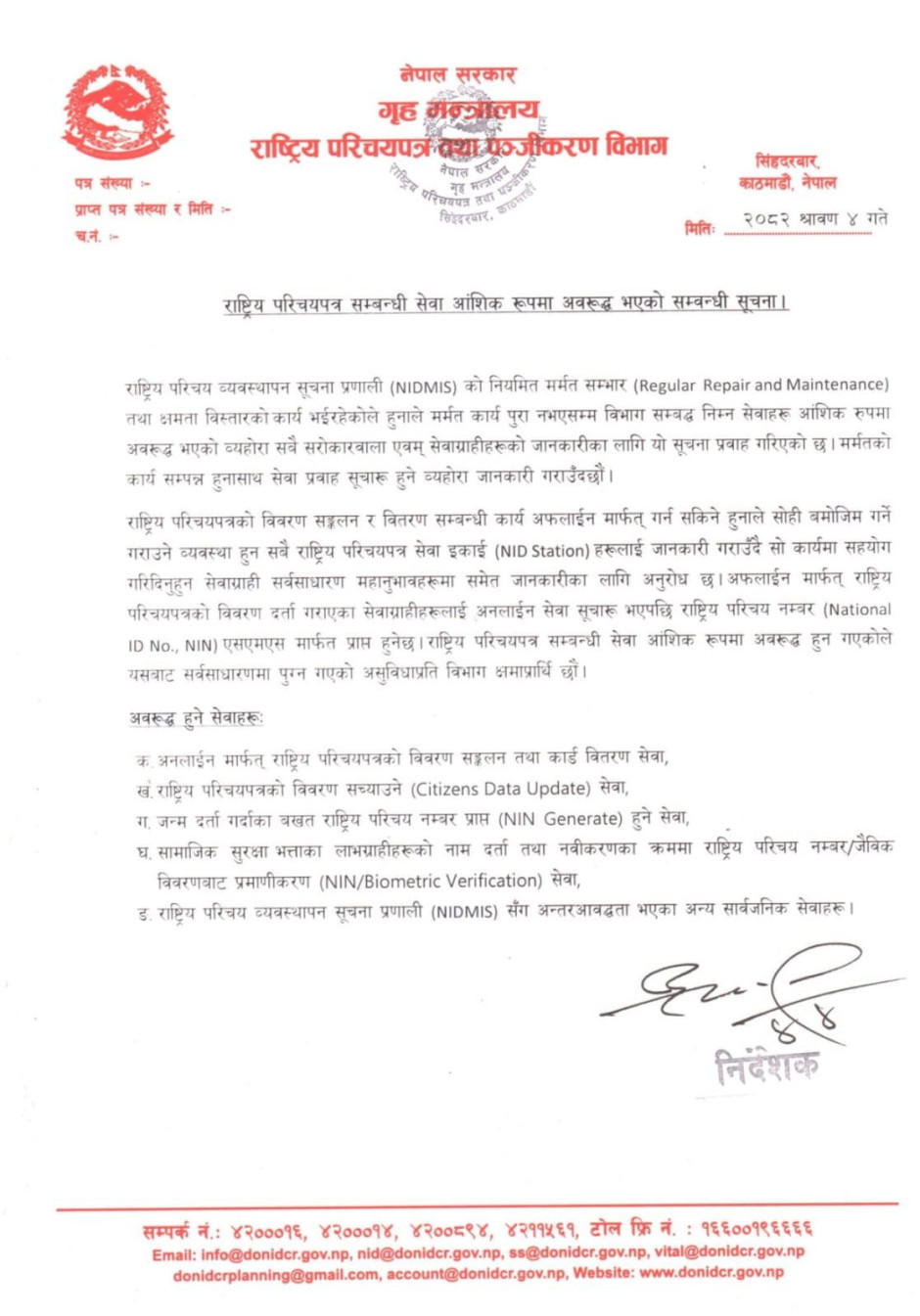 राष्ट्रिय परिचयपत्र सम्बन्धी सेवा आंशिक रुपमा अवरुद्ध भएको सम्बन्धी सूचना ।